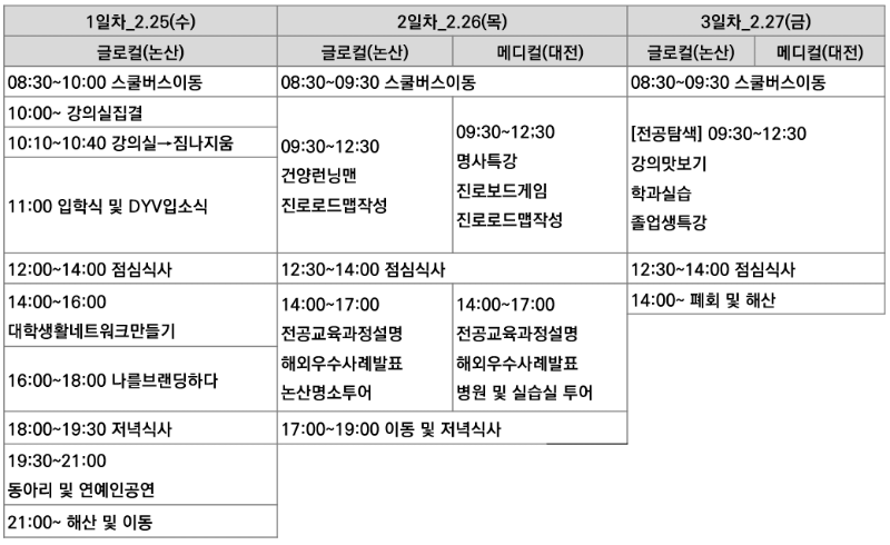 DYV는 입학식과 동시에 진로캠프가 3일 동안 진행되며, 신입생 오리엔테이션 및 친구들과, 그리고 교수님과 미리 친해지는 시간이라고 생각하시면 될 것 같습니다. 필참 사항은 아니오나 3일 모두 참석 시 1학점을 취득하실 수 있고, 링크를 통해 일정을 확인해보시고 참석여부를 답변해주시면 감사하겠습니다^^ 부득이한 사유로 불참할 경우에도 꼭 링크로 답변 해 주시기 바랍니다. 1. 참석여부 조사기한 : ~ 2.5(목) 자정까지 2. 캠프일정 : 2.25(수) ~ 2.27(금) 3. 진로캠프 안내(미리보기) : https://shorturl.at/n6kWp 4. 참석여부 답변 링크 :※ 프로그램 일정